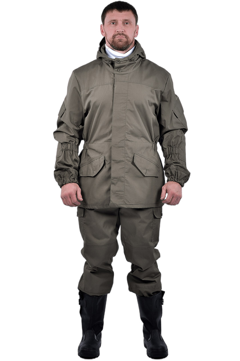 ➠ Куртка: крой прямой, супатая бортовая застежка на пуговицах. На полочках наклонные прорезные карманы с клапаном застегиваются на пуговицы. По линии талии расположена кулиса собранные на эластичную ленту. На рукавах накладные карманы с клапанами фиксирующиеся на контактную ленту, с манжетами. Области локтей усилены налокотниками. Внутренний карман на подкладке левой полочки.