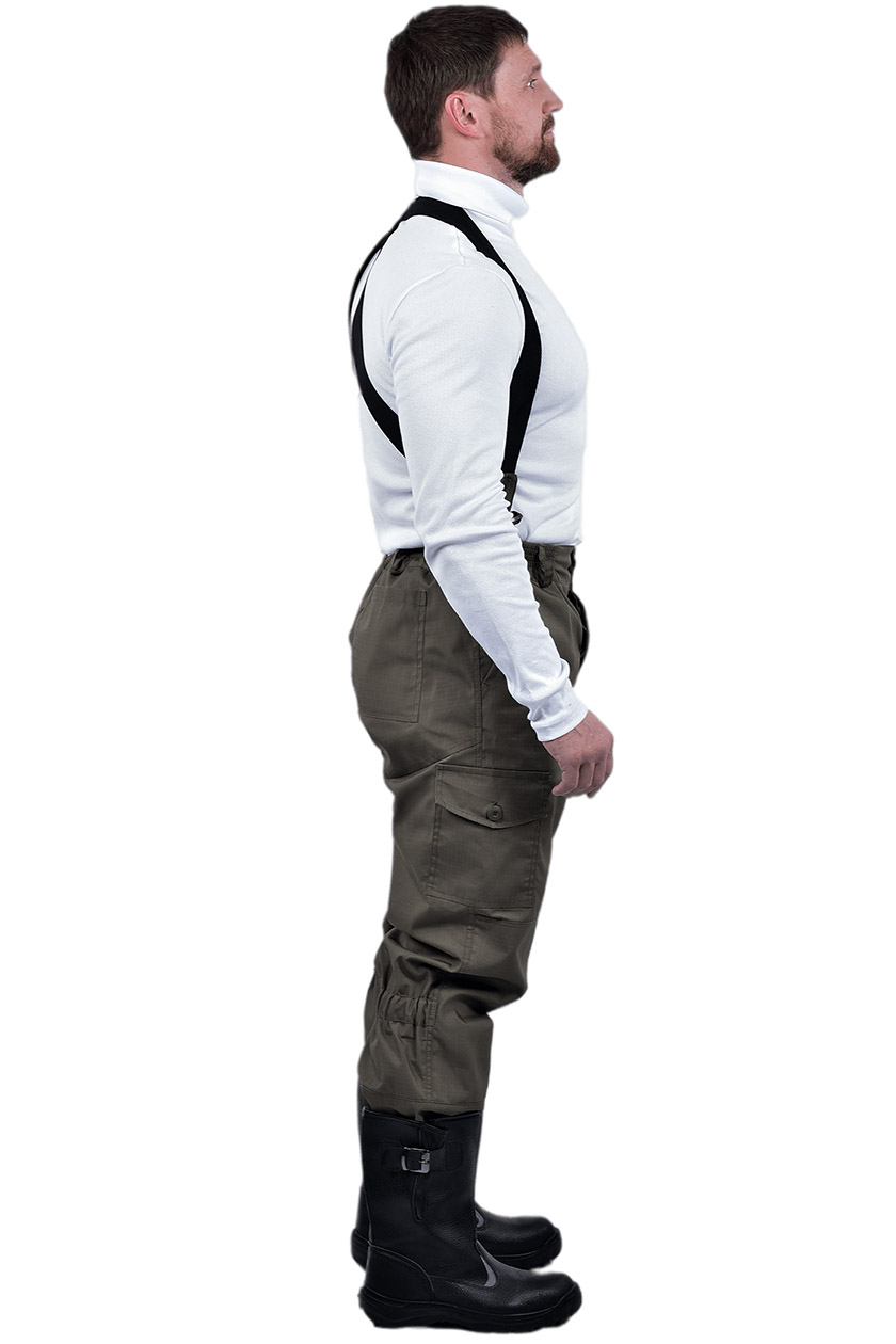 ➠ Брюки: пояс на эластичной тесьме, застегиваются на пуговицы с супатной застежкой гульфика. Бретели на резинке, крепление к брюкам на пуговицы. По линии колена кулиски стянутые эластичной тесьмой, по бокам над коленями накладные карманы с клапанами с застежкой на пуговицу.