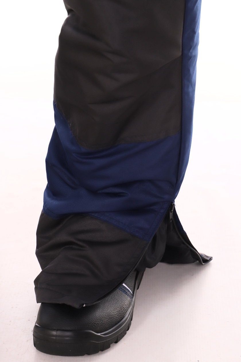 ➠ Полукомбинезон с центральной застежкой на двухзамковую тесьму «молния», с внутренней ветрозащитной планкой, с притачными по линии талии полочками и спинкой. На левой полочке накладной карман с клапаном.. Спинка стянута по линии талии эластичной тесьмой.. Передние половинки с карманами с отрезным бочком, с наколенниками. Внизу боковых швов обработаны разрезы, застегивающиеся на тесьму «молния». По низу полукомбинезона пуфты.