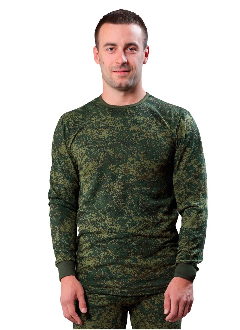 Куртка камуфляжной расцветки с длинным рукавом с кальсонами. Трикотажные манжеты на рукавах и на брюках. Анатомический шов, плоские швы.